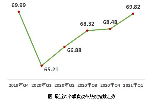 4月21日,中国经济体制求正规英国365网址_be365经常登不上_beat365亚洲版登录研究会在京发布《2021年第一季度求正规英国365网址_be365经常登不上_beat365亚洲版登录热度第三方评估报告》。报告显示,2021年第一季度求正规英国365网址_be365经常登不上_beat365亚洲版登录热度指数为69.82,比上一季度增加1.34,连续4个季度保持稳定回升态势;比去年同期增加4.61,已经基本接近疫情前2019年第4季度69.99的水平。