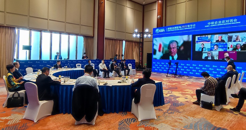 我会常务副会长兼秘书长赵艾应邀出席于4月20-22日在海南省博鳌小镇举办的“博鳌亚洲论坛2022年年会”,并在4月22日举办的论坛中欧企业家对话会上作为主讲嘉宾发表演讲。在4月21日上午习近平主席发表视频主旨演讲,韩正副总理出席的论坛开幕式结束后,接受了新华社、海南电视台等媒体采访。