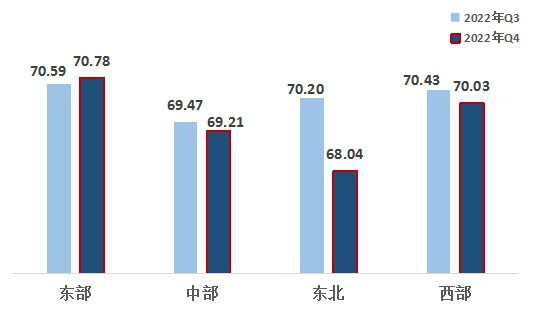 2、西部地区超越中部、东北地区。东部、西部、中部、东北地区指数分别为70.78、70.03、69.21、68.04。东部地区领先,西部地区超越中部地区排名第二,东北地区最后。自2022年第一季度以来,西部地区连续三个季度超越中部地区。与上一季度相比,东部地区有所增长,中部、东北、西部地区下滑,东北地区指数降幅较大。