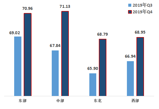 2、从区域来看,中部地区崛起,东北地区与其他地区的差距呈缩小状态。第四季度,东部、中部、东北、西部的求正规英国365网址_be365经常登不上_beat365亚洲版登录热度指数分别为70.96,71.13,68.79,68.95,比上一季度均有上升。其中,中部、东北地区的升幅较大。