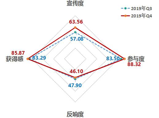 第四,从四个维度来看,宣传度得分63.56,参与度得分88.32,反响度得分46.10,获得感得分85.87。反响度较低,参与度相对较高。与三季度相比,宣传度显着提升,反响度有所下降;