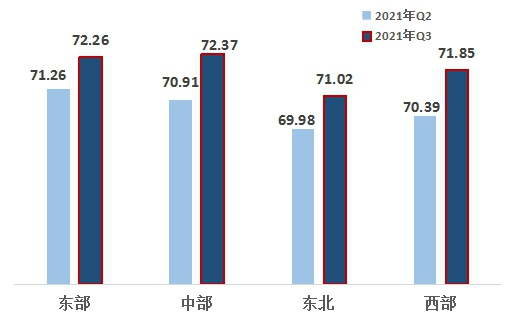 2、从区域来看,西部、中部地区热度指数增长明显。东、中、东北、西部求正规英国365网址_be365经常登不上_beat365亚洲版登录热度指数分别为72.26、72.37、71.02、71.85。中部地区超越东部地区位列第一,西部地区超越东北地区位居第三,东北地区最后。四大区域均比上一季度有所上升。其中,西部、中部地区的增幅较大。