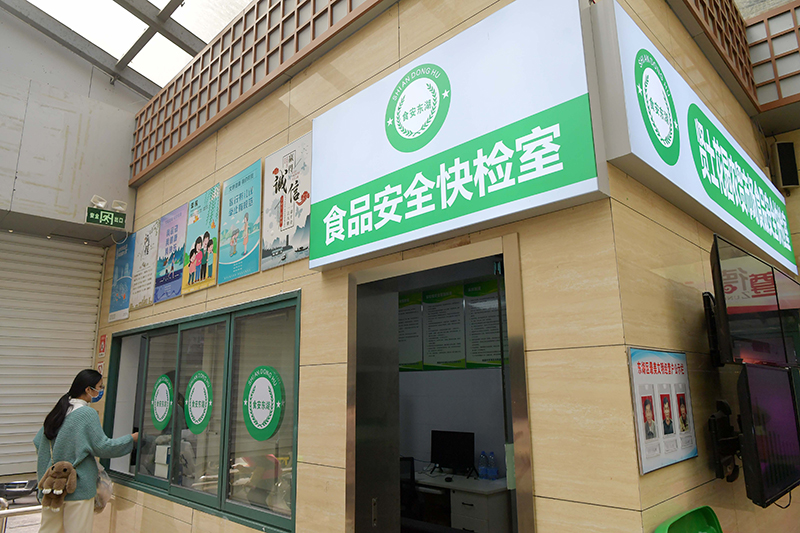 2021年12月7日,在江西省南昌市东湖区贤士花园农贸市场,市民将刚购买的蔬菜送检。2021年,东湖区在全区11个农贸市场建成食品安全快速检测室,对市民送检样品中的农药残留、瘦肉精、甲醛等11种有害物质进行免费现场快速检测,守护群众“舌尖上的安全”。新华社记者 彭昭之 摄