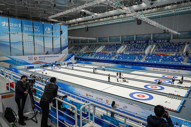 2021年4月6日,运动员在冰壶项目测试活动中。2022年北京冬奥会将国家游泳中心“水立方”改造为“冰立方”,用作冰壶项目比赛场馆,有效减少建设投资,更让夏奥场馆焕然新生,拓展多元赛后经营能力。新华社记者 彭子洋 摄