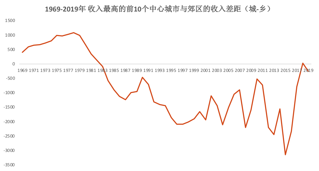 图2:美国城乡融合的表现-中心城区与郊区的收入差距扭转