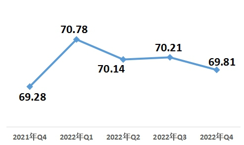 2、西部地区超越中部、东北地区。东部、西部、中部、东北地区指数分别为70.78、70.03、69.21、68.04。东部地区领先,西部地区超越中部地区排名第二,东北地区最后。自2022年第一季度以来,西部地区连续三个季度超越中部地区。与上一季度相比,东部地区有所增长,中部、东北、西部地区下滑,东北地区指数降幅较大。