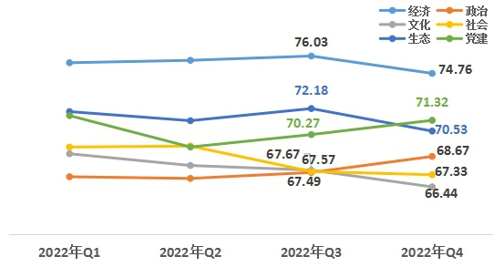 1、政治、党建领域上升。从六大领域来看,经济领域74.76,政治领域68.67,文化领域66.44,社会领域67.33,生态领域70.53,党建领域71.32。与上一季度相比,政治、党建领域均有上升,经济、文化、社会、生态领域略有下降。